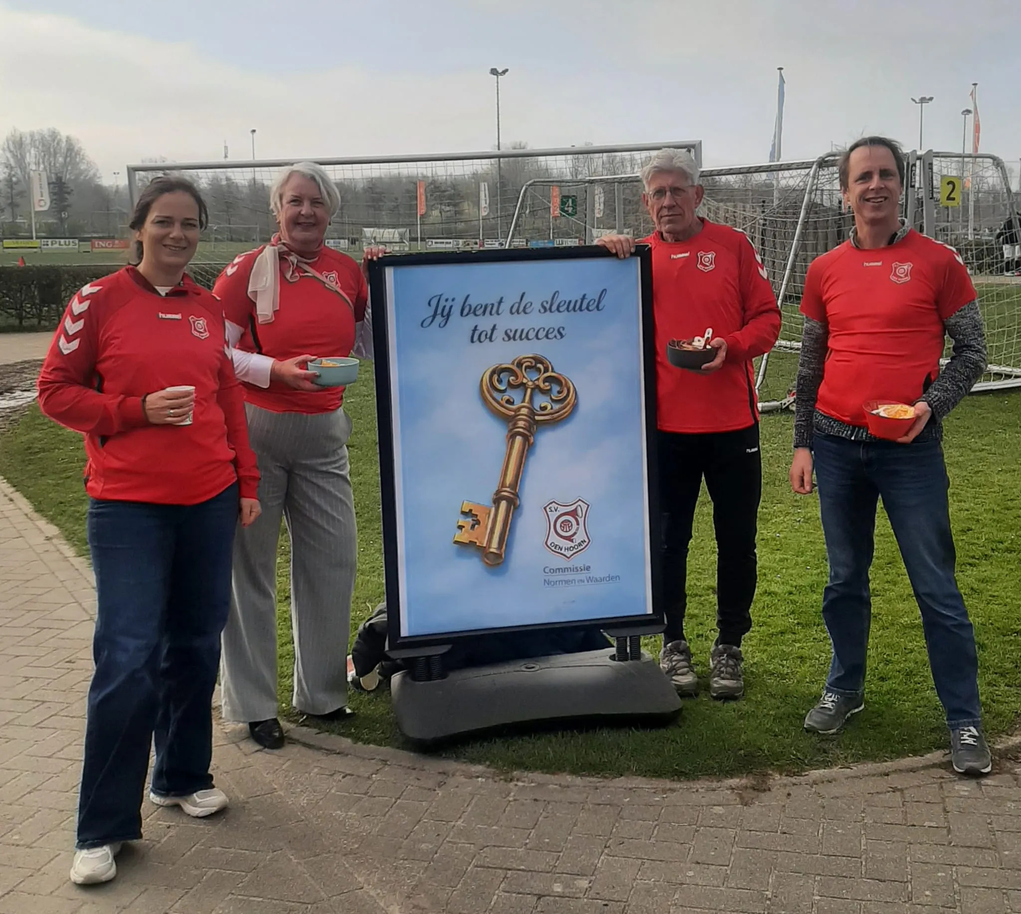 Zaterdagmorgen stonden de 4 enthousiaste leden van de commissie Normen en Waarden bij de ingang met een ludieke actie.